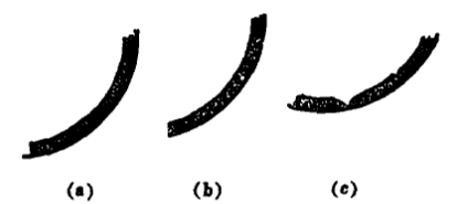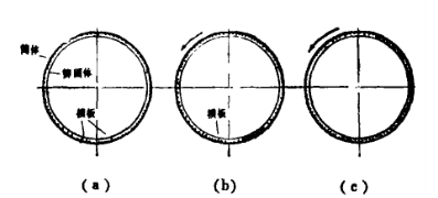 圖2 澆注料初凝時(shí)間不小于45分鐘,從拌料到澆注完畢一檔基本上已凝固,澆注后即可轉(zhuǎn)窯至第二檔位置,見圖2(b),并拆掉模板。一般澆注厚度100毫米,轉(zhuǎn)窯后整體沒有開裂、塌落,如果澆注襯料施工要求很厚,可以在襯料表面加模板,使其托住,如窯口澆注。整個筒體圓周澆注一半養(yǎng)護(hù)6小時(shí),使?jié)沧⒁r料進(jìn)一步凝固硬化,見圖2(c),便于下一步施工。 3.施工中注意的幾個問題 ① 此施工方法由于時(shí)間比較緊湊,要求有一支比較熟練的施工隊(duì)伍(15人),一旦拌料開始要一次將一檔澆注完,因此倒料、加料、拌料、振搗分工要明確,責(zé)任要落實(shí)。技術(shù)人員的責(zé)任主要是控制加水量和檢査振搗密實(shí)情況。 ② 模板支撐要與筒體垂直,與軸線平行,澆注第一檔位置要在筒體底部中央,下一檔轉(zhuǎn)窯時(shí)間要控制好。圖3(a)、(c)兩種情況都會影響澆注襯料的整體強(qiáng)度。而圖3(b)中接縫能獲得整體強(qiáng)度最大效果。