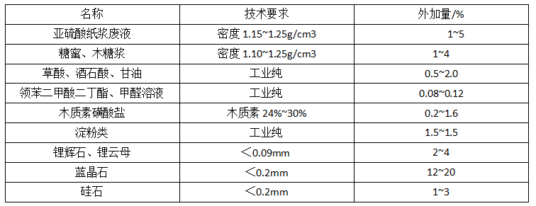 耐火可塑料用的外加劑,主要有保存劑、增塑劑、增強劑和防腐劑等。其外加物有鋰輝石粉(LiO2·Al2O3·4SiO2)、鋰云母粉(LiO2·Al2O3·3SiO2)和膨潤土等燒結劑(亦稱礦化劑),藍晶石或硅線石等膨脹劑。表12-1為不同的外加劑和外加物及其用量。