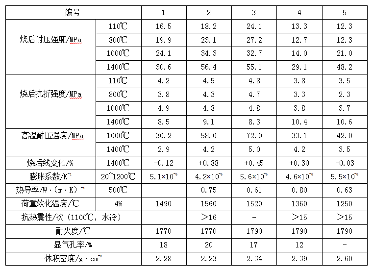 采用濕料坯,人工搗固成型或振動加壓成型,1天后拆模。然后,烘干24h,并檢驗其性能,詳見表1-1。其編號與表1-2對應。因不是同一批的檢驗結果,故無確切的比較性。