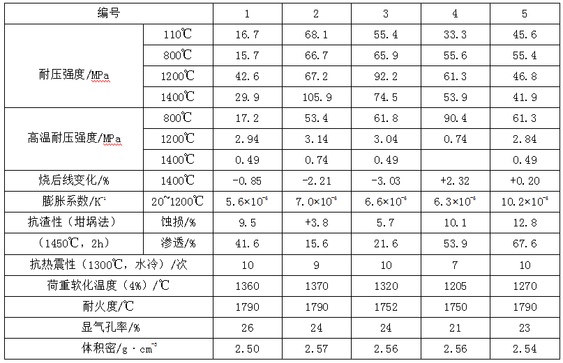 耐火搗打料混煉后,模仿風鎬搗打襯體的體積密度,在壓力機上制樣。試樣自然養護3d,進行烘干并作性能檢測。其檢驗結果,見表1-2,。編號與表1-1對應。