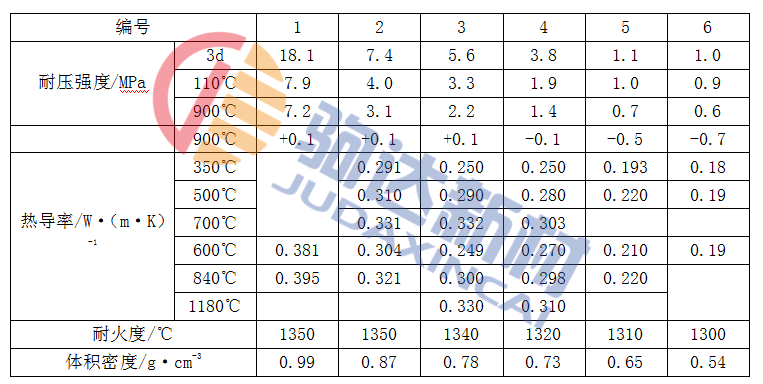 頁巖陶粒耐火澆注料的性能,是用標準試樣按標準檢驗的。按配合比要求,稱量原材料質量,干混均勻,即可加水濕混煉。拌和料倒進模內,振動臺震動成型或手工振動成型,直至料面返漿為止。因為系采用原皮陶粒作耐火骨料,吸水率較小,故不能先濕潤陶粒再加粉料和水泥。成型后的試樣,自然養護1天拆模,再自然提高于25℃時,試樣或襯體初凝后,應進行潮養護。從表中看出,頁巖陶粒耐火澆注料的性能是優良的。體積密度為0.99g/cm3的澆注料,3天耐壓強度大于10MPa,可作成預制塊進行吊裝,同時燒后線變化呈膨脹狀態(陶粒二次膨脹所致),高溫下不易產生裂紋,有利于使用。