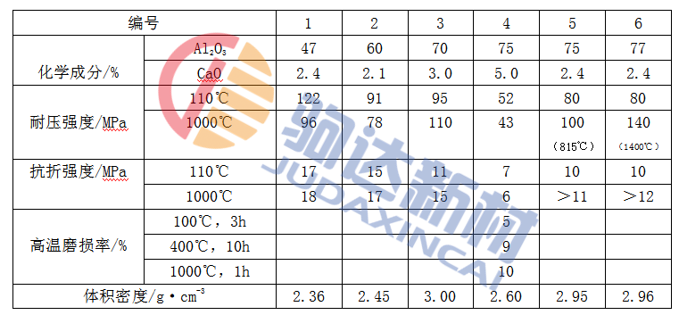 耐磨耐火澆注料用的耐火骨料,應(yīng)致密堅(jiān)硬,用多級(jí)顆粒級(jí)配,達(dá)到最大的堆積密度;耐火粉料細(xì)度為0.09mm的應(yīng)大于90%。選擇優(yōu)良的結(jié)合劑、超微粉和外加劑,使?jié)沧⒘线_(dá)到致密、高強(qiáng)。因此,該類(lèi)料具有很高的強(qiáng)度和良好的耐磨性。表1-1為耐磨耐火澆注料的性能。表中編號(hào)6含Cr2O3 3%左右,成型體經(jīng)1420~1480℃燒成,用于軋鋼加熱爐滑軌和平臺(tái),使用效果較好。如經(jīng)600℃烘烤,應(yīng)加強(qiáng)基質(zhì)配料,保證在1200℃時(shí)能夠燒結(jié),即能達(dá)到足夠高的高強(qiáng),提高制品的耐磨性。