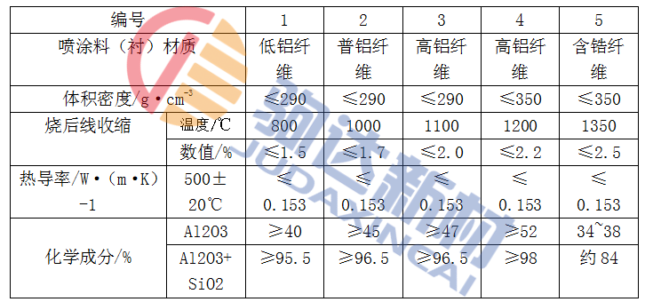 耐火纖維噴涂料(襯)是用專門噴涂機將預處理好的纖維高壓送至噴槍、同時用膠泵將結合劑送至噴槍外環(huán)縫隙內,纖維和結合劑邊噴出槍口邊混成一體噴射到受噴面上,便形成噴涂層。然后,用便攜式針刺機進行二次絞織處理,使其成為三維網(wǎng)絡結構,以提高襯體縱向抗拉強度,延長使用壽命。表1-1為耐火纖維噴涂料(襯)的性能。