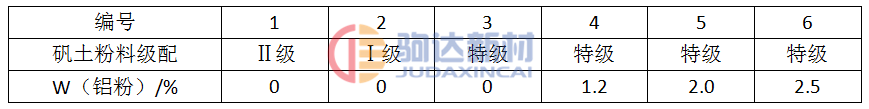 選定適當?shù)脑项w粒級配,然后調(diào)節(jié)粉料和外加一些金屬鋁粉,稱好料,加水量的水,攪拌均勻,在振動臺上振動成型,養(yǎng)護1d后脫模,放入烘箱中在110℃24h烘干。試樣編號及粉料加入級別和金屬鋁粉加入量如表1所示。