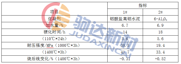 為了進(jìn)一步提高粘土結(jié)合澆注料的使用溫度,設(shè)想用σ-Al2O3替代鋁酸鹽水泥做促凝劑,并在實(shí)驗(yàn)室條件下(氣溫20℃)做了對比試驗(yàn),試驗(yàn)結(jié)果如表3所示。