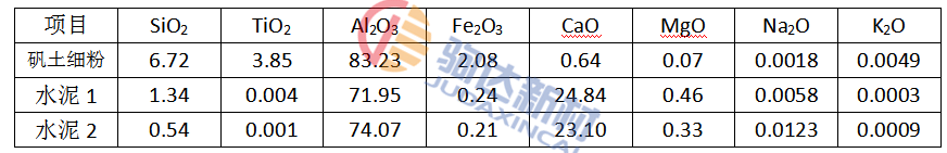 由于本實驗主要是針對高鋁澆注料漿體部分進(jìn)行的,因此,細(xì)粉的質(zhì)量、細(xì)度至關(guān)重要。為保證試驗結(jié)果的可比性,全部采用特級礬土細(xì)粉,其粒度<0.088mm,比表面積為4396cm2·g-1。