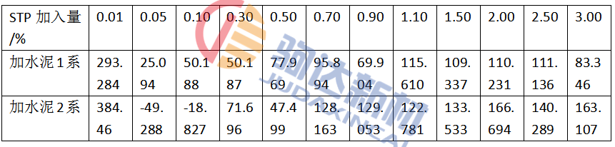 由于STP為六點環(huán)狀結(jié)構(gòu),而STP為鏈狀結(jié)構(gòu),因此,可以推測,SHP遇水時發(fā)生電離應(yīng)比STP容易,電離出的陰離子基因也較多,從而對顆粒的吸附作用增強(qiáng),分散性較強(qiáng),顆粒之間的接觸點減少,表現(xiàn)在流變曲線上,即為以SHP為添加劑的漿體,具有較小的觸變性。同樣,由于STP在水中電離出的陰離子基因較多,其吸附-分散作用、潤濕作用及潤滑作用均較強(qiáng),從而能使水泥顆粒充分分散,內(nèi)粘滯阻力小,其表觀粘度也相應(yīng)較小。