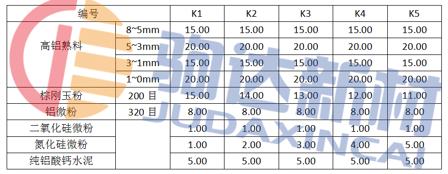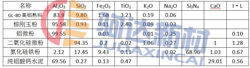 主要原料包括GL-80高鋁熟料、棕剛玉粉、鋁微粉、二氧化硅微粉、純鋁酸鈣水泥等,其化學組成見表1。