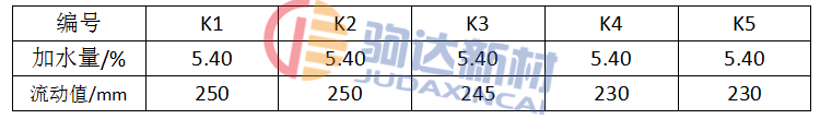 流動值測定方式:將攪拌好的料裝進高(60±0.5)mm,上口內徑為Φ(70±0.5)mm,下口內徑Φ(100±0.5)mm的截錐圓模中,并放置在GZ-85型水泥膠砂振動臺上,待料表面返漿后,輕輕拔掉圓錐體震動30s,使拌合料自由平鋪開來,測4個方向的直徑并取平均值,即是該料的流動值。