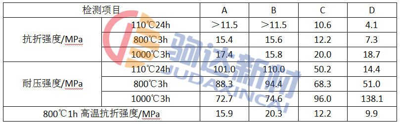 試樣烘干強度隨著純鋁酸鈣水泥含量的增加而增大。添加白泥可以促進試樣在中溫下燒結,提高試樣中溫性能。綜合對比各配方的試驗結果,根據熔鋁爐工作特點,擬采用C配方作為生產配方。