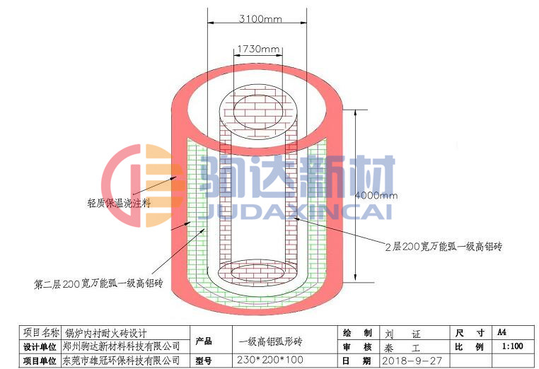我公司是專業(yè)從事耐火材料的生產(chǎn)制造與窯爐的設(shè)計(jì)安裝工作,主要生產(chǎn)耐火磚有高鋁材質(zhì)、粘土材質(zhì)、剛玉材質(zhì)、碳化硅材質(zhì)和輕質(zhì)隔熱耐火磚等耐火材料,近期我公司收到東莞雄冠環(huán)保科技有限公司,發(fā)來的30t熱解爐使用耐火材料的分布圖并希望能夠得到我公司在材料與設(shè)計(jì)安裝上的支持,收到相關(guān)資料后我公司設(shè)計(jì)安裝部門進(jìn)行了核對,并繪制相關(guān)使用的萬能弧耐火磚的設(shè)計(jì)砌筑方法。雄冠環(huán)保提供的熱解爐相關(guān)資料。