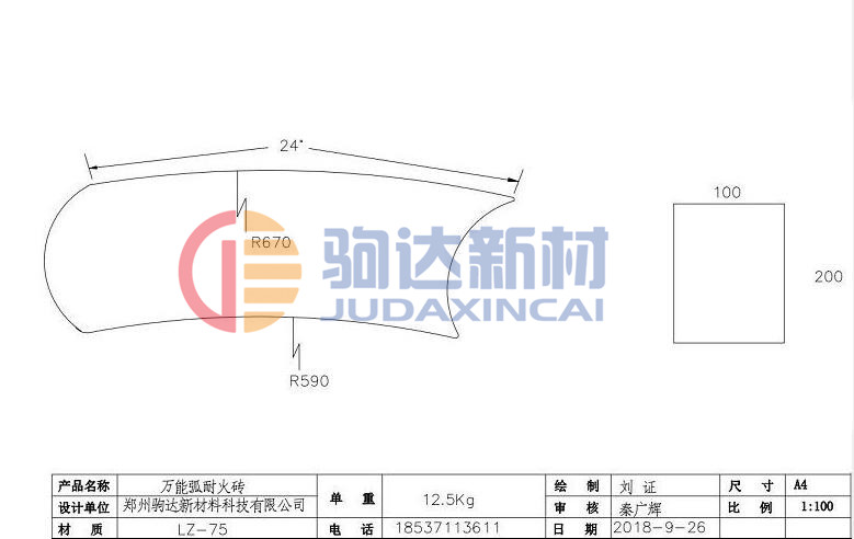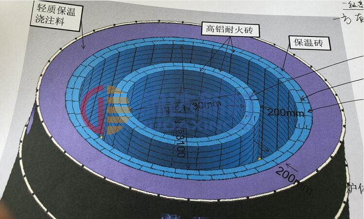 我公司根據(jù)相關(guān)資料設(shè)計(jì)內(nèi)襯耐火材料使用的磚型為萬能弧耐火磚,改雙層壁厚為單層壁厚,萬能弧耐火磚型尺寸定為280X200X100(mm),下圖(1)為我公司設(shè)計(jì)圖紙,砌筑方法為:外層緊貼爐殼為輕質(zhì)保溫澆注料體積密度為1.3g/cm³,內(nèi)層為萬能弧耐火磚,單層砌筑每圈需要數(shù)量為39塊,下圖為設(shè)計(jì)方案(2)。