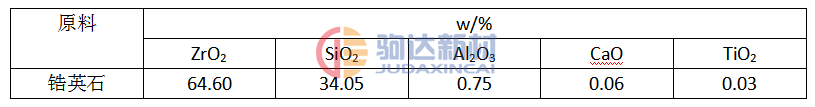 試驗(yàn)所用的主要原料為w(Al2O3)=70.65%的燒結(jié)莫來(lái)石(5~3、3~1、≤0.088mm)、w(SiC)=97.9%的碳化硅(3~1、1~0.5、≤0.5mm)、鋯英石細(xì)粉,結(jié)合劑包括SiO2微粉、水泥細(xì)粉(w(Al2O3)=69.3%,w(CaO)=29.7%)和p—Al2O3細(xì)粉。鋯英石的主要化學(xué)組成見(jiàn)表1。