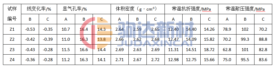 按照相關(guān)國(guó)家標(biāo)準(zhǔn)分別檢測(cè)試樣的線變化率、顯氣孔率、體積密度、常溫抗折強(qiáng)度和常溫耐壓強(qiáng)度。