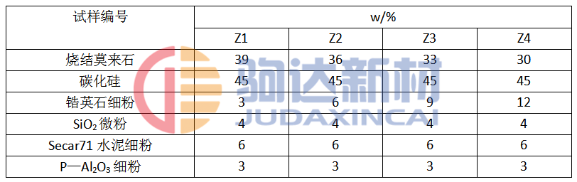 固定骨料和基質(zhì)細(xì)粉的質(zhì)量比為70:30,Z1、Z2、Z3、Z4分別添加鋯英石細(xì)粉(w)3%、6%、9%和12%以替代燒結(jié)莫來(lái)石細(xì)粉。試驗(yàn)配方如表2所示。