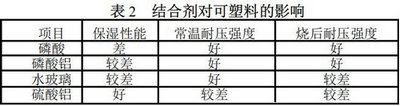 結(jié)合劑對可塑料的保濕性能影響最大 ,對其他性能也起到關(guān)鍵的作用 ,如果選擇不當(dāng) ,可塑料將無法滿足使用要求。表 2 為結(jié)合劑對可塑料性能的影響。