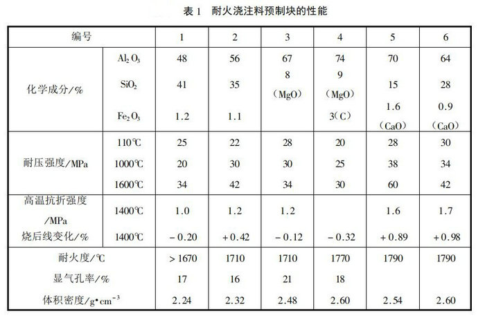 應(yīng)當(dāng)指出,凡是耐火澆注料和耐火可塑料等材料,均可作預(yù)制塊。由于生產(chǎn)條件比現(xiàn)場(chǎng)施工好,因此性能也有所提高,一般可參見(jiàn)前述有關(guān)性能,F(xiàn)舉例,見(jiàn)表1。編號(hào)1和編號(hào)2為 CA-50水泥和磷酸黏土質(zhì)澆注料預(yù)制塊,其骨料為小于10mm的黏土熟料顆粒70%,小于0.09mm的高鋁粉分別為15%和30%,CA-50水泥分別為15%和2.5%。前者摻加減水劑,水用量為10%。后者用濃度為42.5%的磷酸作結(jié)合劑,用量13%;編號(hào)3和編號(hào)4為水玻璃鋁鎂質(zhì)澆注料預(yù)制塊,其骨料和粉料為一級(jí)礬土熟料,小于5mm的骨料用量60%,粉料分別為30%和26%,制磚鎂砂粉10%,模數(shù)為2.8、密度為1.32g/cm³的水玻璃用量9%,后者加4%的鱗片石墨;編號(hào)5和編號(hào)6分別為低水泥和超低水泥高鋁質(zhì)澆注料預(yù)制塊。預(yù)制塊的形狀,主要有方形、長(zhǎng)條形、拱形和環(huán)形等,均為特異形制品。