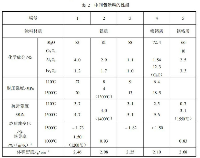 中間包耐火涂抹料簡(jiǎn)稱(chēng)中間包涂料,分為鎂質(zhì)、鎂鈣質(zhì)和鎂鉻質(zhì)3種,其性能見(jiàn)表2。編號(hào)1用燒結(jié)鎂砂作原材料,其臨界粒徑為3mm,大于1mm的用量35%,1~0.09mm的用量25%,小于0.09mm的用量30%,其余為結(jié)合劑和外加物,用水拌和即可使用;編號(hào)2與編號(hào)1的配制原則,基本相似,小于3mm的耐火骨料55%~65%,耐火粉料30%~40%,軟質(zhì)黏土約為5%,三聚磷酸鈉3%左右,緩凝劑0.6%~1.0% ,水用量為12%~15%;編號(hào)3為優(yōu)質(zhì)鎂砂作耐火骨粉料,摻加軟質(zhì)黏土和SiO2超微粉,結(jié)合劑為三聚磷酸鈉,同時(shí)摻加防爆劑金屬鋁粉或纖維;編號(hào)4以燒結(jié)鎂砂為主料,摻加適量的鈣質(zhì)材料、硅微粉和復(fù)合外加劑配制成的,用聚磷酸鹽作結(jié)合劑;編號(hào)5為鎂鉻質(zhì)涂料,是由燒結(jié)鎂砂、鉻鐵礦、軟質(zhì)黏土、三聚磷酸鈉和消石灰組成的。