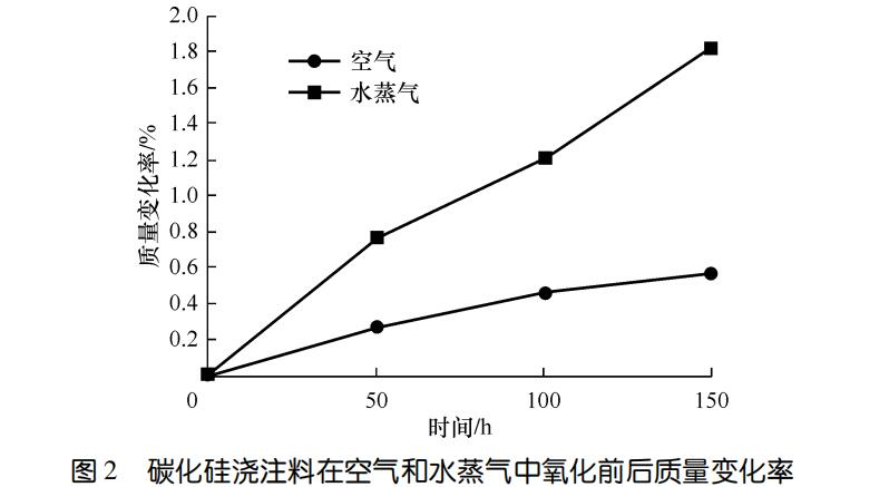 圖2示出了碳化硅澆注料在空氣和水蒸氣中氧化前后質量變化率。可以看出,隨著時間的延長,空氣和水蒸氣條件下質量變化率均增大,水蒸氣條件下質量變化率增加速度明顯高于空氣條件下的。可能是因為水蒸氣條件下,SiC首先會與水蒸氣反應生成SiO2,并且氧化層SiO2繼續與水蒸氣發生反應生成Si(OH)4,起不到保護作用。從氧化反應控制機制來看,在空氣條件下,隨著時間的延長,氧化反應由化學反應控制轉向擴散控制,速率減緩;在水蒸氣條件下,氧化反應主要受化學反應控制.