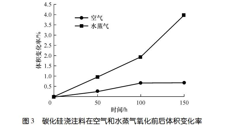 圖3示出了碳化硅澆注料在空氣和水蒸氣中氧化前后體積變化率。可以看出,空氣條件下體積變化率明顯小于水蒸氣條件下的。隨著時間的延長,空氣條件下的體積變化率趨于平緩和穩定;在水蒸氣氧化后期,體積變化率異常增大,與試樣的結構遭到較大破壞引發顯氣孔率略有增加相吻合。高溫下水蒸氣向SiC磚孔隙中的滲透能力增加,同時由于高溫蒸發而造成的強制流動,改善了反應動力學條件,表觀活化能較小,氧化反應易于進行。