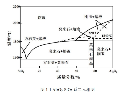 耐火澆注料是由一定級(jí)配的骨料、細(xì)粉、結(jié)合劑和外加劑按一定比例組成的耐火混合料,因其具有生產(chǎn)工藝簡單、生產(chǎn)周期較短、節(jié)能等優(yōu)點(diǎn)被廣泛使用。 高鋁系列耐火澆注料是由 Al2O3和SiO2作為基本化學(xué)組成的耐火澆注料。高鋁系列耐火澆注料的相組成可以從 Al2O3-SiO2 系相圖得到。從圖1-1可以看出,Al2O3的熔點(diǎn)為2050 ℃,SiO2的熔點(diǎn)為1723 ℃。在該系統(tǒng)中,唯一穩(wěn)定的二元化合物為莫來石,其化學(xué)組成為3Al2O3·2SiO2(Al2O3為71.8%,SiO2為28.2%),莫來石的熔點(diǎn)為1850 ℃。由于莫來石的存在,系統(tǒng)被劃分為兩個(gè)子系統(tǒng):SiO2-莫來石子系統(tǒng),固化溫度為1595 ℃,共晶點(diǎn)組成接近SiO2一側(cè),以及Al2O3-莫來石子系統(tǒng),固化溫度為1840 ℃,共晶點(diǎn)組成接近Al2O3一側(cè)。